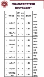 2014年3月26日,中国校友会网最新编制完成《2014中国大学评价研究报告》。《报告》指出,毕业生中杰出政界校友数量体现了一所大学对治理国家和社会所需政界人才的贡献能力。北京大学造就92名杰出政要校友,跃居2014中国大学杰出政要校友榜榜首。