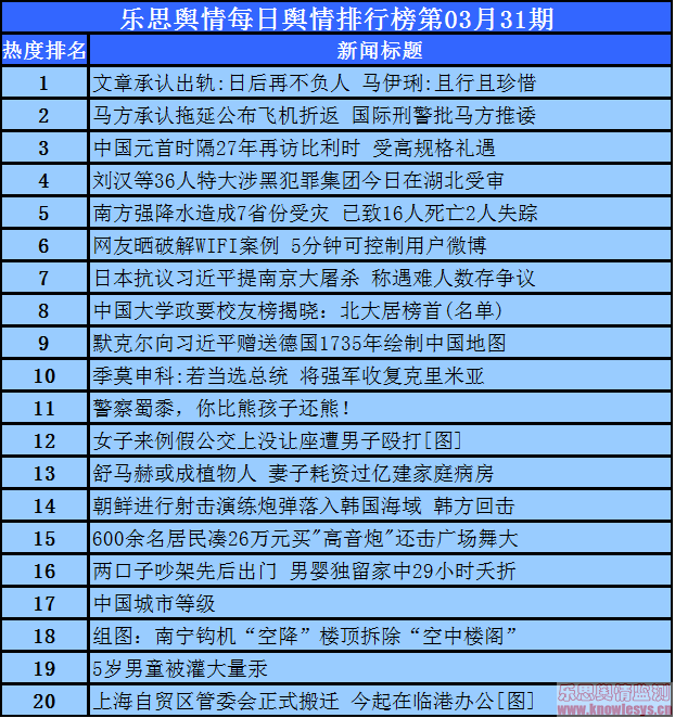 2014年3月31日乐思每日舆情热点排行榜导读:文章承认出轨:日后再不负人 马伊琍:且行且珍惜;马方承认拖延公布飞机折返 国际刑警批马方推诿;中国元首时隔27年再访比利时 受高规格礼遇;刘汉等36人特大涉黑犯罪集团今日在湖北受审;南方强降水造成7省份受灾 已致16人死亡2人失踪……
