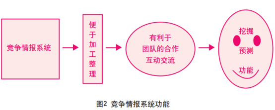 国内竞争情报软件提供商在艰苦地为生存而战,我想很重要的一个方面是缺少智能化的思想,希望能够建一个大而全的系统来完全取代人的思维活动,使竞争情报工作自动化程度更高,这种想法是不现实的。应该说作为一名竞争情报从业人员的专业化程度是很高的,每个人所能监测的领域范围是有限的。企业真正的情报工作应该是由一个团队来完成的,需要多方合作,这也是国内所缺少的团队合作精神。当然我也知道现在国内有在这方面做得非常好的企业。竞争情报系统实际上应该是一种有利于团队共同来完成企业竞争情报的系统。它应该是企业的发展战略系统,如图2。