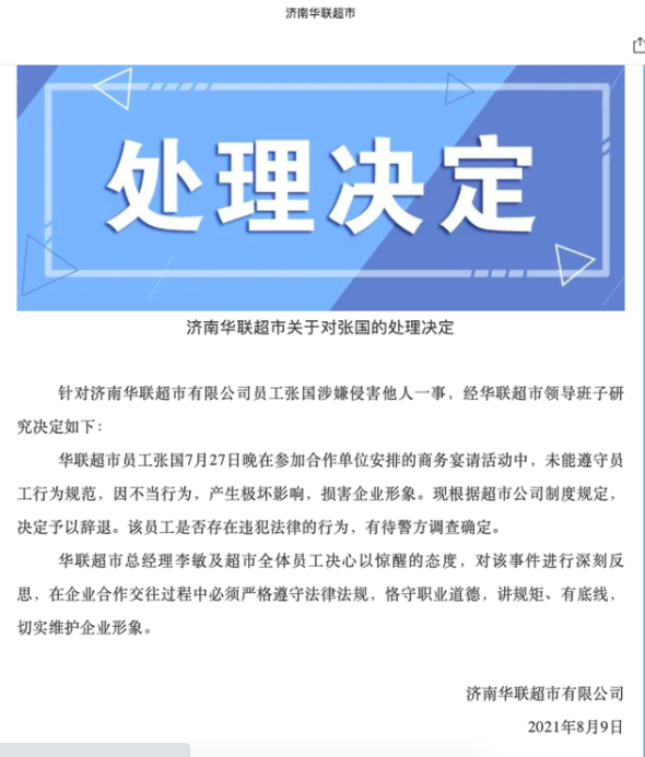 乐思网络舆情发现,8月9日下午,对于“阿里女员工被侵害”中的涉事员工,济南华联超市发布了处理决定。