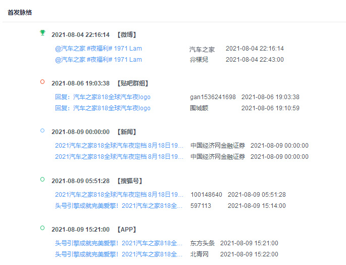 从首发传播内容及平台来看,首先发布全球汽车夜相关信息的平台是微博,其次是贴吧群组;定档后新闻平台开始介入传播。