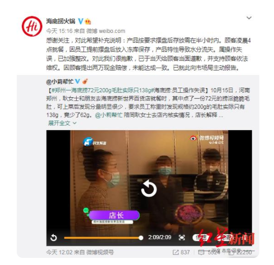 乐思网络舆情监测发现,据河南电视台民生频道@小莉帮忙报道,10月15日,耿女士和朋友去河南郑州海底捞新世界百货店就餐时,点了一份72元的捞派脆脆毛肚,可上菜后发现分量明显偏少,要求员工称重时发现,规格约200克的毛肚实际只有138克,少了62克。