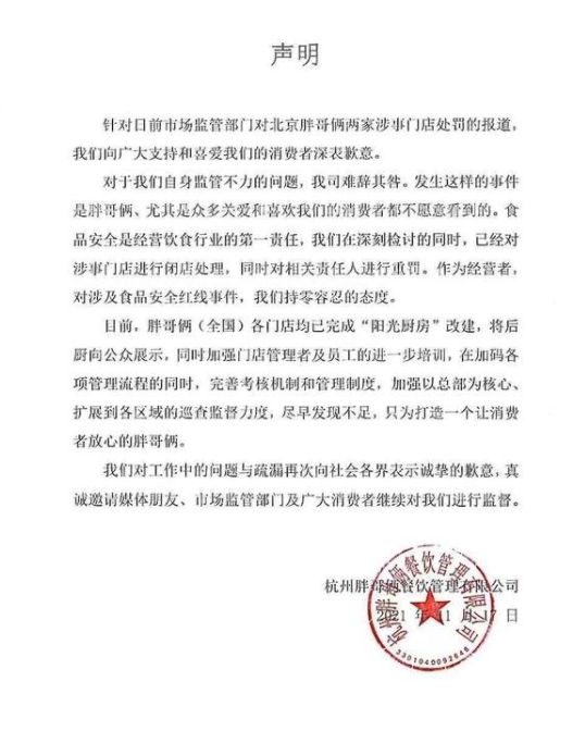 对此,胖哥俩发布声明称,“目前,胖哥俩(全国)各门店均已完成‘阳光厨房’改建,将后厨向公众展示,同时加强门店管理者及员工的进一步培训。”