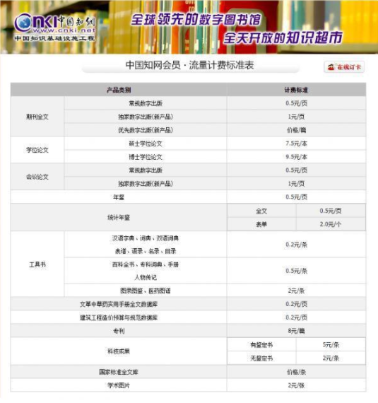 中国知网官方网站上公布的“中国知网会员·流量计费标准表”。