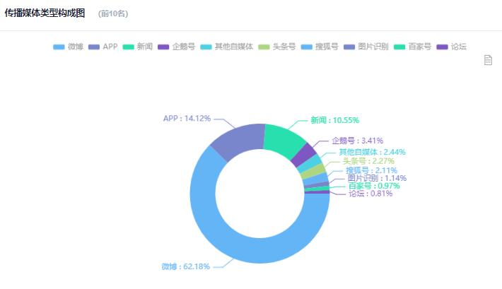 从媒体占比来看,网友对微博话题的关注使得微博占比大,其次是APP,主要是搜狐新闻客户端、腾讯看点客户端、凤凰新闻客户端、手机搜狐、新浪财经等平台。排在第三的是新闻平台,主要包括懂车帝、凤凰网、中国网、网易、同花顺金融服务网。
