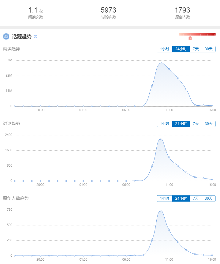 相关话题在18日上午11点左右到达阅读、讨论和原创发布趋势的最高值,随后下降,在下午14点左右热度基本平息。