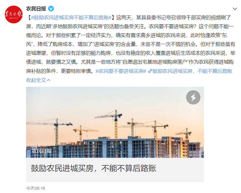 18日,针对鼓励农民进城购房措施,农民日报发布信息表示“鼓励农民进城买房,不能不算后路账”,话题#农民日报评多地鼓励农民进城买房#登上热搜,截至目前引发1.1亿次阅读。