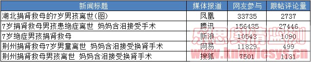 7岁绝症男童肾救母一事经媒体报道后,立即受到各路媒体的关注和转载。综合乐思舆情监控系统3日的监测数据,截至15时20分,该话题已有超过20万人参与互动,跟帖超3万条。热度最高的单条网络新闻是腾讯新闻“7岁捐肾救母男孩患绝症离世 妈妈含泪接受手术”。天天的故事感动着千万网友,传播正能量,大家纷纷送祝福。