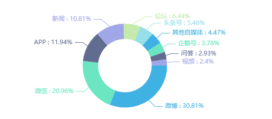 2月5日至2月15日,各渠道信息总量分布比例图如下,视频占比最高为41%,微博第二占比20%,微信占比第三7%,其他媒体上信息量共占比32%。