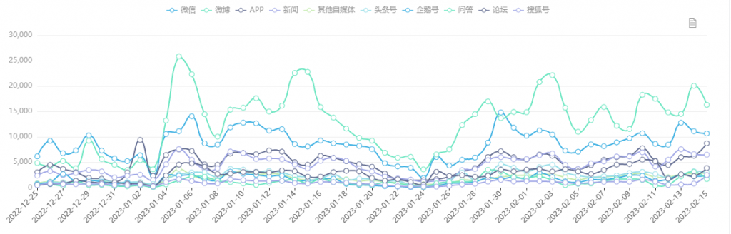 2023.1.5-2023.1.24,全网信息量从72499篇的顶峰逐步下降到13143篇;可能是临近春节,新闻、媒体等工作者放假影响;