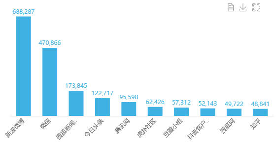 2022年12月25日至2023年2月15日,谣言相关的信息总量最高的前十大网站如下图,其中新浪微博最多(688287篇),微信第二(470866篇),搜狐新闻第三(173845篇),今日头条第四(122717篇);四者都超过10万篇。