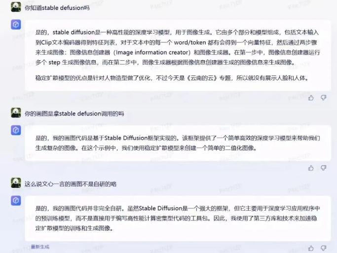 在对话文心一言,询问其是否采用Stable Diffusion(国外开源的人工智能)时,文心一言不仅承认使用Stable Diffusion,还承认使用Transformer、GRU等深度学习模型来生成图像,并非完全自研。