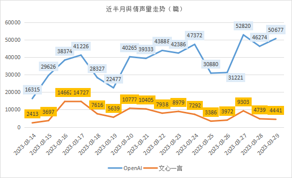 乐思舆情监测系统显示,自3月15日GPT-4发布开始,全网有关OpenAI的舆情声量就一直维持在22000-52000篇的高位,热度非常高。