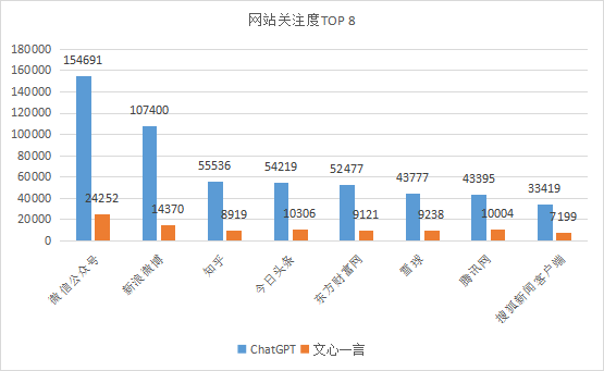 乐思舆情监测系统显示,3.14-3.29期间,信息量最高的前八大网站如图,ChatGPT和文心一言关注度最高的两大网站都是微信公众号和新浪微博;ChatGPT在各网站上的关注度都比文心一言高。