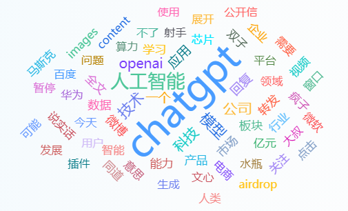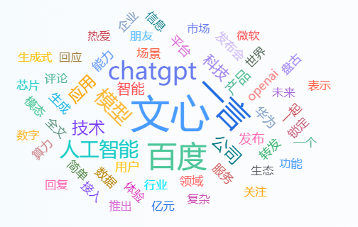 从乐思舆情监测系统解析的云图来看,ChatGPT的热词为“ChatGPT”、“人工智能”、“模型”、“科技”、“技术”等,文心一言的热词为“文心”、“百度”、“一言”、“模型”、“人工智能”等。人工智能、模型都是两者的热词。