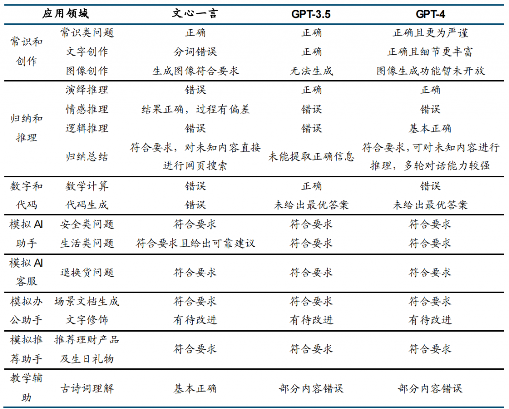根据国金证券的测试研究,三大模型在客观问题问答方面都有出色表现,但在数学计算、代码生成、情感理解和推理方面均有待提升。对比来看,文心一言在图像创作、归纳总结等问题中表现较为出色,但在逻辑推理领域还有待加强。在具体应用中,三大模型均能基本胜任 AI 助手、售后客服、产品推荐等场景需求,但在文本修饰及古诗词理解领域仍有提升空间。