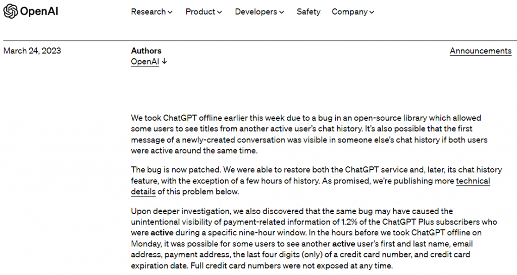 3月24日左右,由于一个开源库中的错误,导致一些ChatGPT用户可以看到另一个活动用户聊天历史记录中的标题,而且新创建的对话的第一条消息也有可能会在另一个用户的聊天历史记录中可见。另外,同样的错误可能会导致1.2%的 ChatGPT Plus 订阅用户在特定的九个小时时间窗口内意外地看到与支付相关的信息。