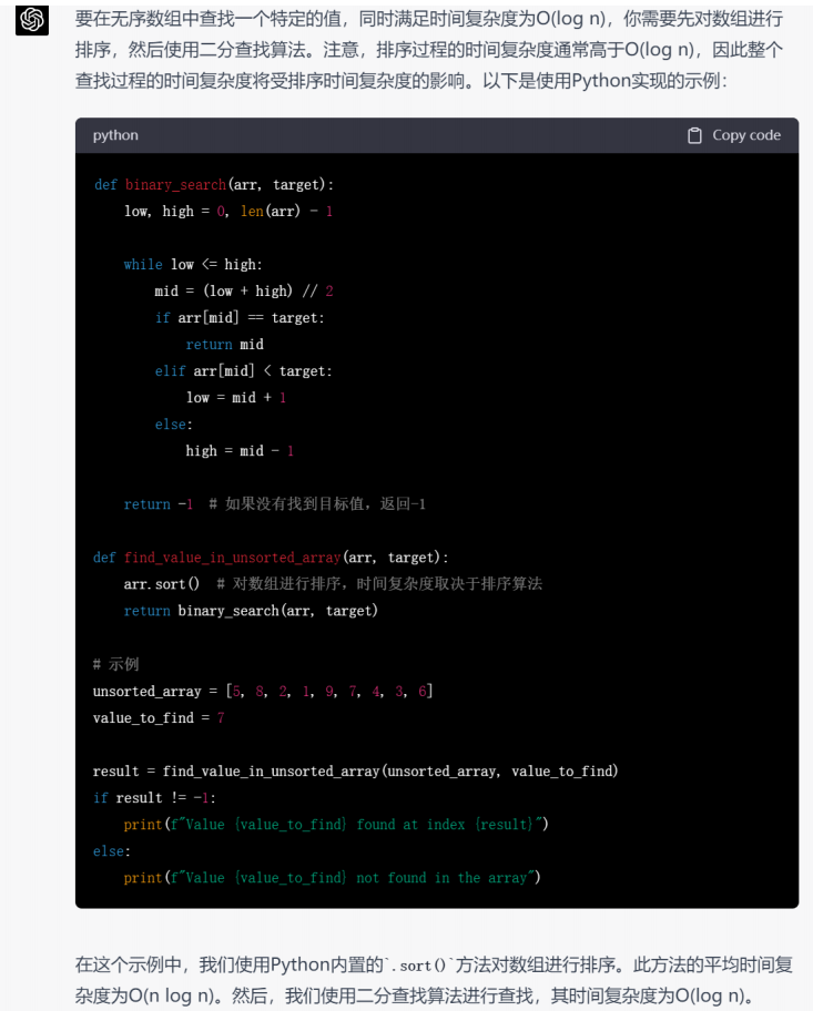 “用 Python 编写一个程序,在一个无序数组中查找一个特定的值。要求程序的时间复杂度为 O(log n)。”