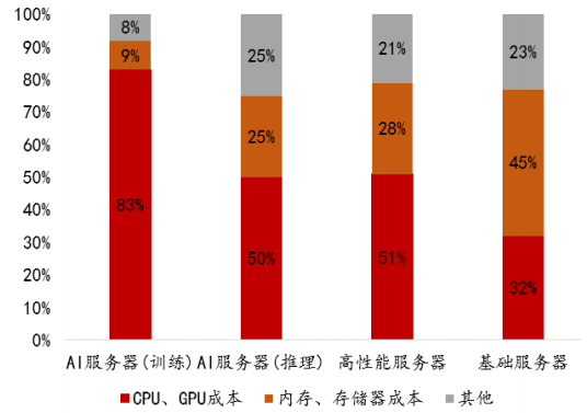 如上图,在AI服务器中,AI芯片在大模型训练中成本最高,同时AI芯片是AI算力的“心脏”。人工智能深度学习需要异常强大的并行处理能力,GPU相比于CPU更擅长于并行计算能力,正在大放异彩。根据IDC的数据,2021年H1中国AI芯片,GPU占比最多为91.90%。