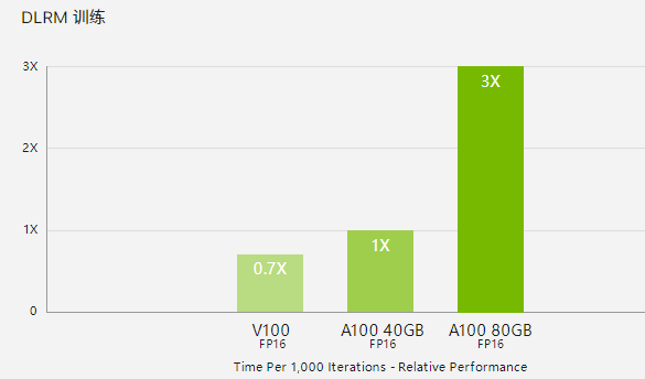 A100 提供 40GB 和 80GB 显存两种版本,A100 80GB 将 GPU 显存增加了一倍,对于具有庞大数据表的超大型模型(例如深度学习推荐模型 [DLRM]),A100 80GB 可为每个节点提供高达1.3TB的统一显存,而且吞吐量比 A100 40GB 多高达 3 倍。