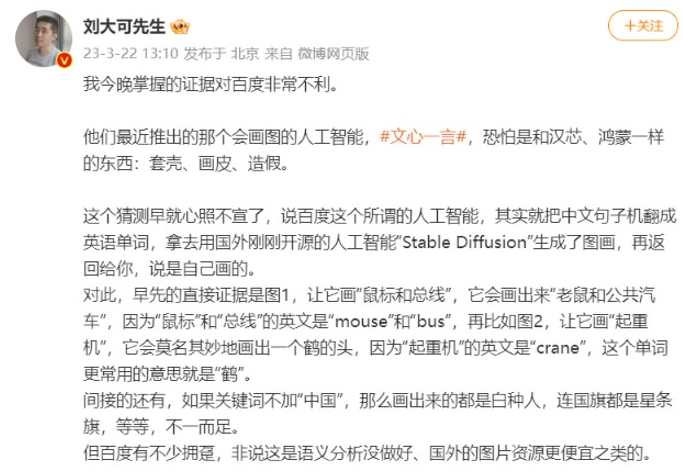 3月23日,百度在微博表示,已注意到对文心一言文生图功能的相关反馈,并回应说明如下: