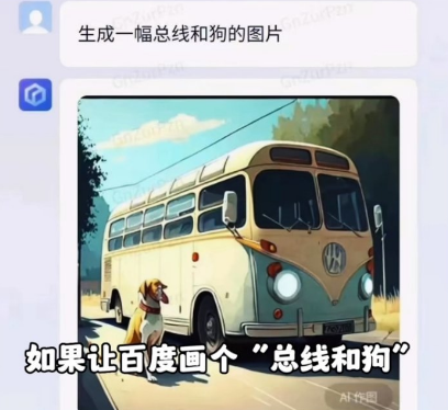 比如,让文心一言生成一幅“总线和狗”的图片,结果却创作出了一张公交汽车和狗的照片。因为英文的“bus”有公交车和总线的意思。