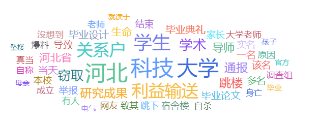 监测期间,“科技”一词出现次数最多,达到243次;其次是“河北”,出现了243次。出现次数排名前十的词分别为:科技、河北、大学、学生、利益输送、关系户、学术、窃取、研究成果、通报。
