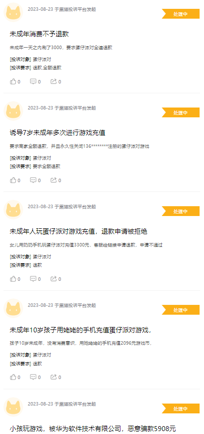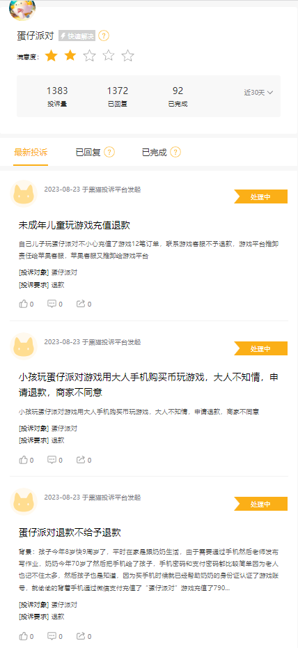 通过对平台投诉信息来看,投诉内容主要是退款相关,但都为处理中。