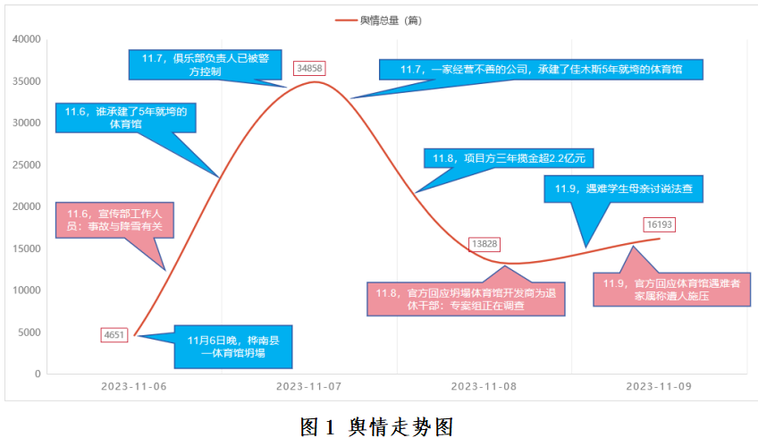 2023年11月6日至11月9日,全网共采集到佳木斯体育馆坍塌事件相关舆情信息69530篇。6日晚,一位网友向极目新闻爆料称,桦南县一处体育馆发生坍塌,且事发时有孩子在体育馆内;随后央视等各大媒体纷纷报道,尤其是宣传部工作人员回应称事故与降雪有关的说法引起争议,舆情量不断升高。7日,警方介入,有关部门开始调查和处理事故,舆情量达高峰的34858篇,之后舆情量走低。但各家媒体对事故的原因和责任深挖发现,体育馆工程方可能与退休干部有关,官方回应正在专案调查后,舆情量再次走高。9日,一遇难学生母亲讨说法的视频在微博和抖音等平台广泛传播,网友和媒体怀疑遇难者家属遭人施压,官方再次回应,舆情量也不断冲高;11月9日全天共16193篇,依然处于广泛热议状态。