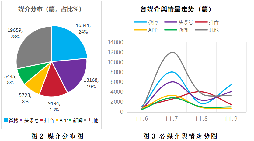 11.6-11.9四天全网舆情总量69530篇中,微博16341篇(24%),今日头条13168篇(19%),抖音9194篇(13%),APP共5723篇(8%),新闻5445篇(8%),其他媒介共19659篇(28%)。在新闻媒体中,发文最多的10大媒体账号分别是:澎湃新闻(394篇)、新京报(314篇)、南方都市报(222篇)、九派新闻(208篇)、光明网(192篇)、极目新闻(176篇)、看看新闻KNEWS(151篇)、红星新闻(150篇)、海报新闻(140篇)和上游新闻(133篇)。