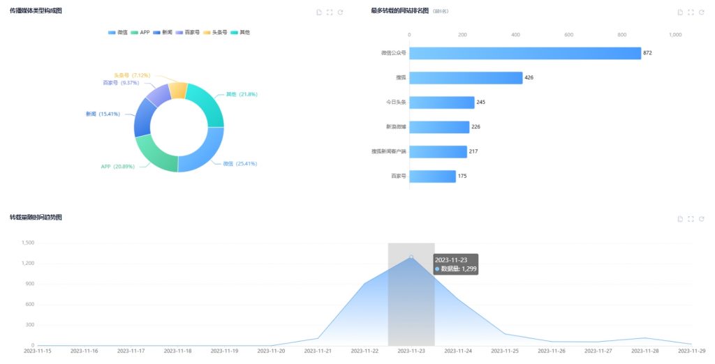 根据乐思软件监测发现,截至目前相关舆情信息共有3427条,其中11月23日到达传播高峰期,该日约有1299条。