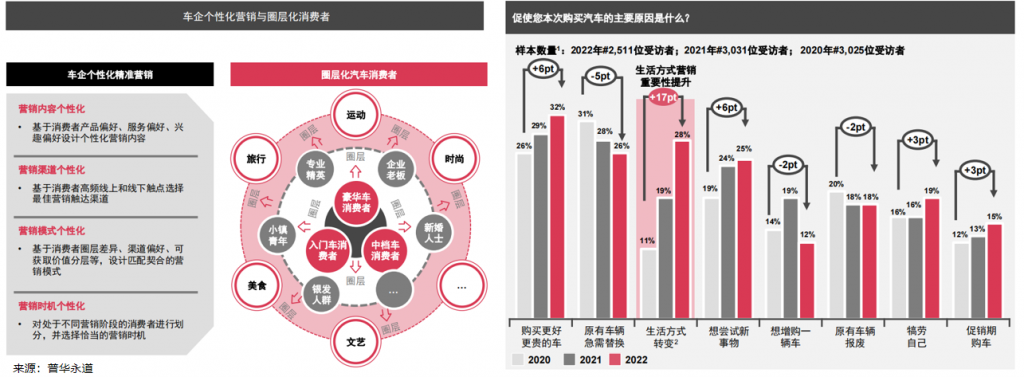 1、普华永道认为,新能源车消费者更加注重自我与生活方式的选择,新一代消费群体的圈层化特征愈加凸显,形成由身份、兴趣爱好等标签划分的不同“部落”。消费者购车需求和价值偏好更加多元化和个性化,各圈层内部具备极高的认同感和营销裂变效果。车企营销观念从以产品为中心的“物以类聚”到以用户为中心的“人以群分”,营销重心从“线索为王”转变为“圈层为王”,深度圈层运营成为车企的营销共举。