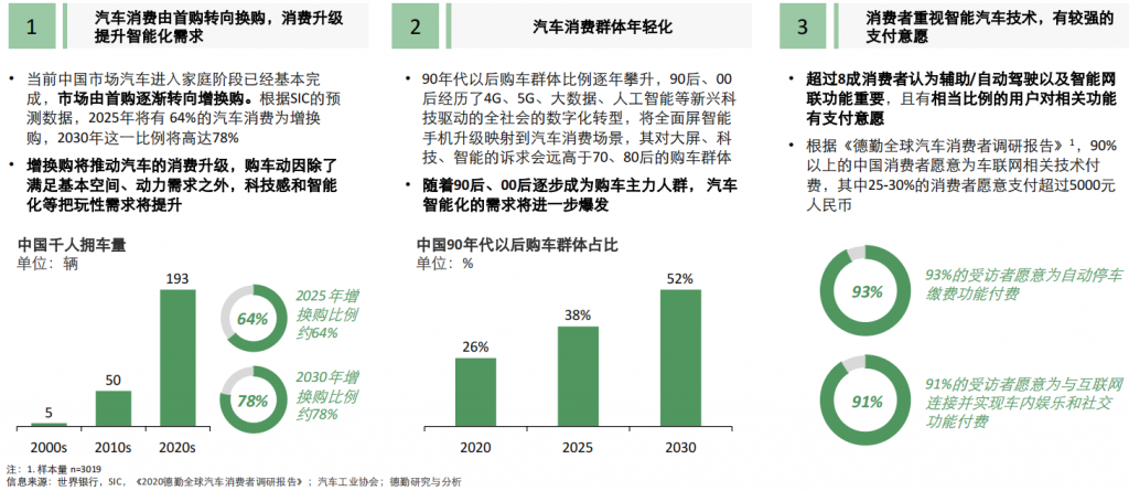 3、德勤认为随着汽车消费逐渐由首购转向增换购,汽车消费群体年轻化,消费者也逐渐从需要满足基本空间、动力的需求转而追求智能化、辅助/自动驾驶等附加功能,并愿意为之而付费。