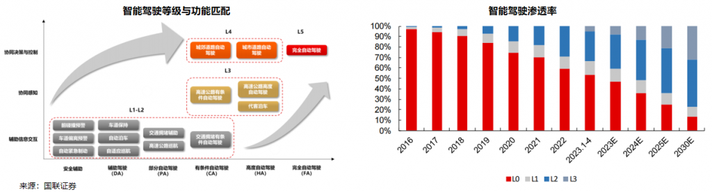回顾自动驾驶技术发展历程,技术是其中的核心推动力:1)早期(2017 年以前):以 Mobileye 为首的智能驾驶公司为主流,黑盒模式占领市场;2)成长期(2017-2020 年)特斯拉吹响车企布局自研号角,HW3.0 BEV+Transformer 算法(FSD)大获成功,车企成为技术推动力;3)爆发期(2021 年至今):国内智能化潮流涌动,新势力切换 BEV 模式,模型效率大幅提升,产品上 L2+智能驾驶逐渐普及。技术驱动下,目前国内 L2 级自动驾驶/高速 NOA (自动辅助导航驾驶)已经成熟。2023年可以说是城市NOA元年,如:华为宣布到今年底将全国实现HUAWEI ADS 2.0高阶智能驾驶系统的应用。小鹏宣布到今年底在50个城市实现无图的城市NGP功能,到2024年将覆盖全国主要路网,并同步推向欧洲等。理想宣布今年底将实现100个城市无图NOA功能。另外,11月17日,工信部、公安部、住建部、交通运输部联合发布《关于开展智能网联汽车准入和上路通行试点工作的通知》,正式对L3/L4自动驾驶的准入规范进行了具体要求,同时开启了对首批企业的遴选工作,标志着我国对L3/L4级自动驾驶上路正式完善了政策支持。