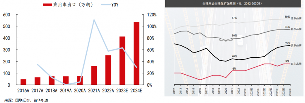 由于全球汽车大国海外市场份额均有较高比重,长期以来中国自主品牌汽车产品力和品牌力不足加之缺乏合适的时机,出海一直未能取得显著进展。2021 年以来,受疫情以及地缘政治等影响,加之缺芯等问题,海外汽车供应链遭受冲击,国内汽车出口获得发展机遇;加之中国电动智能汽车在全球属于第一梯队,新能源车渗透率遥遥领先,实现了对燃油车的弯道超车,近几年出口量不断大增。2023年1-10月我国累计实现汽车出口 325.5万辆,同比增长64.9%;预计 2023 全年乘用车出口 410万辆,2024 年达530 万辆。自主品牌未来几年将持续发力扩张海外电动车和燃油车双市场,尤其是将凭借电动车产品在智能化、自动驾驶、车联网等方面先发优势进一步渗透欧洲等发达国家市场。