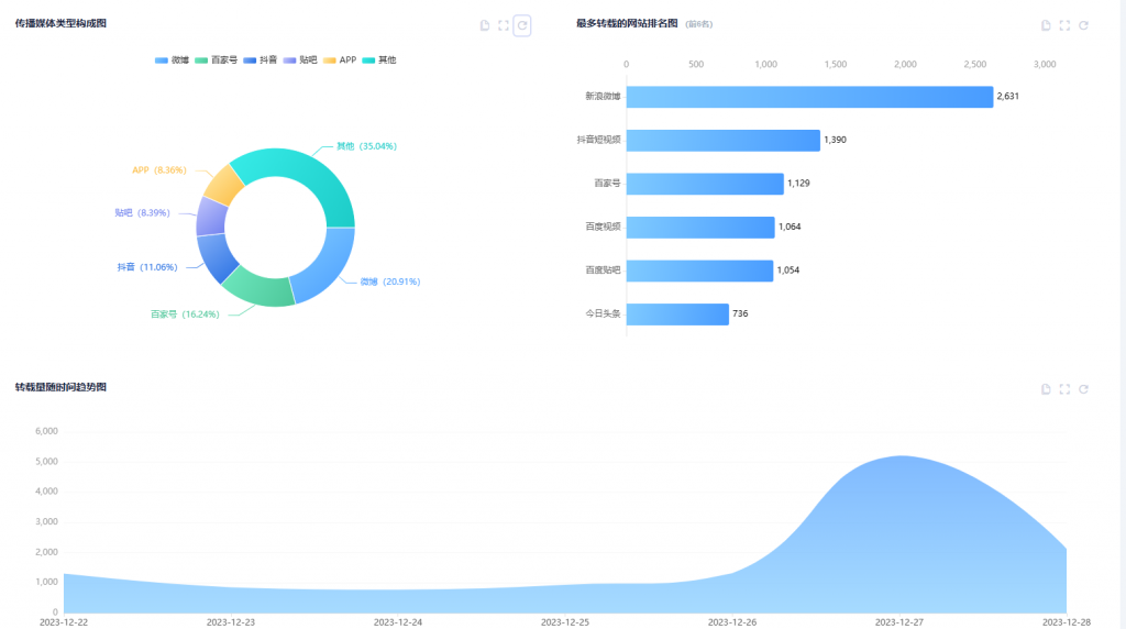 传播媒体top3包括其他媒体、微博、百家号;最多转载的网站top3包括新浪微博、抖音短视频和百家号。