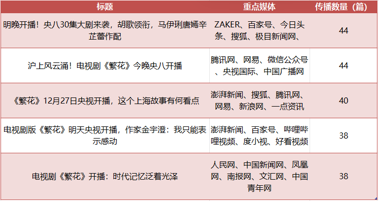 从整体传播趋势来看,《繁华》首播日网络舆情到达近七天最高峰,改日约有5214篇相关信息,数据量再28日后下降。
