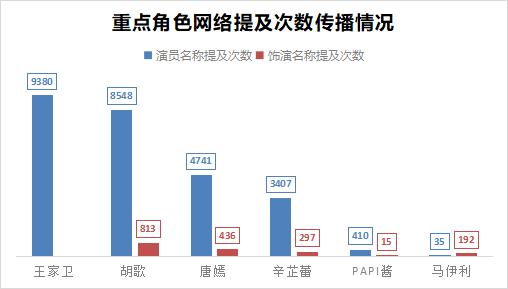 从电视剧情的演员角色提及传播情况来看,前三提及传播排名与演员名称提及排名基本保持一次,马伊利的提及次数较少,但剧中角色“玲子”的提及排在第四,而演员papi酱的演员名称提及次数会高于剧中名称。