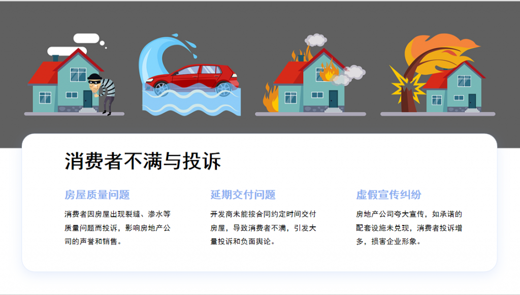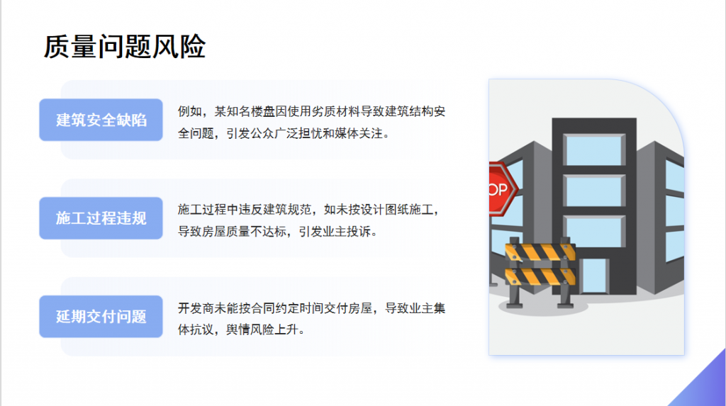 - 2. 质量问题风险: 房屋质量、装修问题、配套设施不完善等,容易引发业主维权和媒体曝光,损害企业形象。
