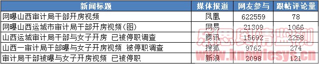 山西审计局干部与女子开房视频在网上曝光后,话题舆情热度迅速膨胀,媒体和微博报道量不断攀升。统计乐思舆情监控系统8日的采集数据,截至17时,“山西审计局干部与女子开房”媒体报道量为269篇,新浪腾讯微博曝光量为1597条。最热单挑网络新闻为凤凰网“网曝山西审计局干部开房视频”的报道。干部被爆出开房事件让山西运城审计局站到了舆论的风口浪尖。