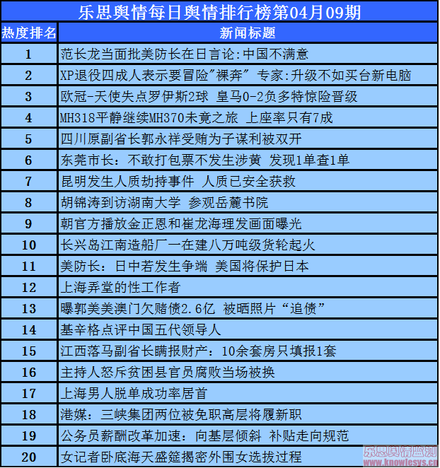 2014年4月9日乐思每日舆情热点排行榜导读:范长龙当面批美防长在日言论:中国不满意;XP退役四成人表示要冒险”裸奔” 专家:升级不如买台新电脑;欧冠-天使失点罗伊斯2球 皇马0-2负多特惊险晋级;MH318平静继续MH370未竟之旅 上座率只有7成;四川原副省长郭永祥受贿为子谋利被双开……