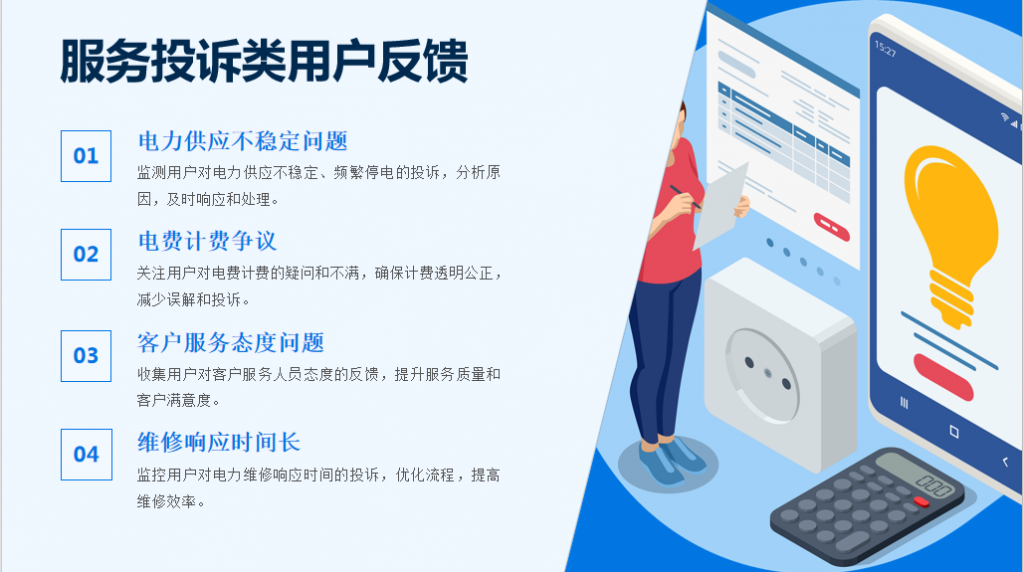 - 服务投诉类:电价争议、服务态度、缴费问题等用户反馈;