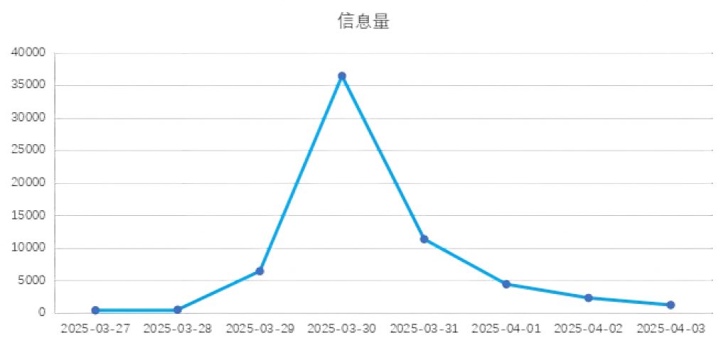 2025年3月27日 – 4月3日期间,信息总量为 62,649 篇,其中在3月30这一天达到最大值 36,379 篇。
