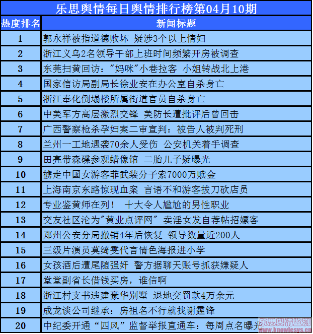 2014年4月10日乐思每日舆情热点排行榜导读:郭永祥被指道德败坏 疑涉3个以上情妇;浙江义乌2名领导干部上班时间频繁开房被调查;东莞扫黄回访:”妈咪”小巷拉客 小姐转战北上港;国家信访局副局长徐业安在办公室自杀身亡;浙江奉化倒塌楼所属街道官员自杀身亡……