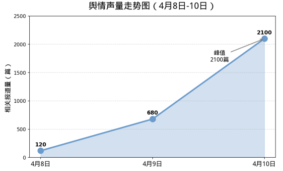 4月8日曝光当日相关报道约120篇,4月9日升至约680篇,4月10日达到峰值约2100篇,舆情热度在官方确认后快速攀升。