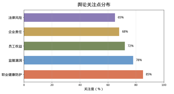 舆论关注主要集中在职业健康防护(85%)、监管漏洞(78%)、员工权益(72%)、企业责任(68%)和法律风险(65%)五个维度。