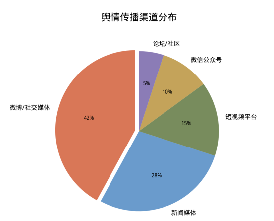 舆情传播渠道以微博/社交媒体为主(42%),其次是新闻媒体(28%)和短视频平台(15%)。