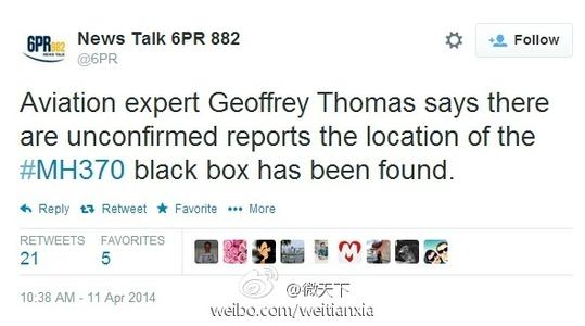 澳大利亚珀斯当地电台“6PR”称,航空专家托马斯称,有未经证实的报道称MH370的黑匣子位置已经确定。