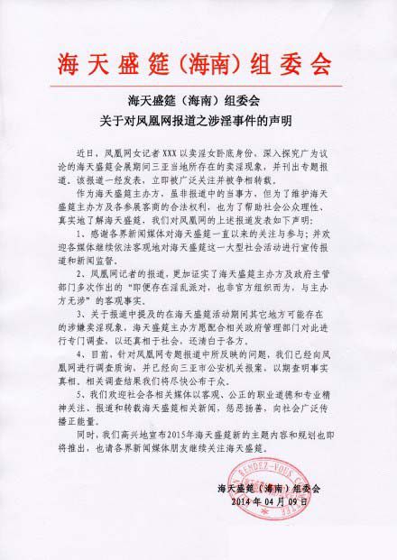 近日,某网女记者卧底海天盛筵,并曝出会展期间三亚当地所存在的卖淫现象,引起广泛关注。昨日,海天盛筵主办方发声明称,已经向该媒体进行调查质询,并向三亚市公安机关报案,相关调查结果将尽快公诸于众。
