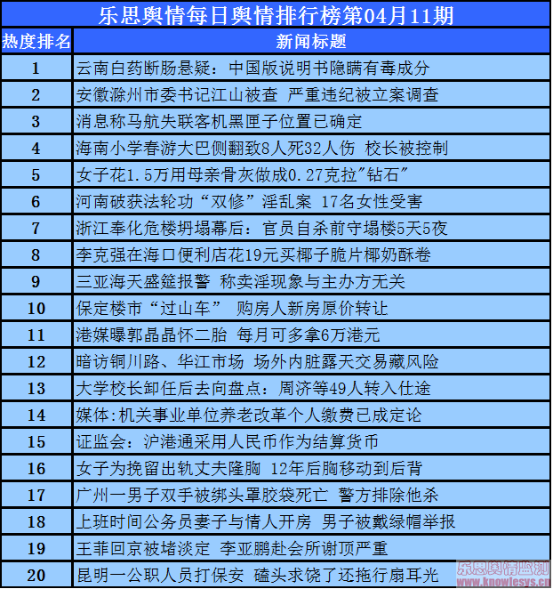 2014年4月11日乐思每日舆情热点排行榜导读:云南白药断肠悬疑:中国版说明书隐瞒有毒成分;安徽滁州市委书记江山被查 严重违纪被立案调查;消息称马航失联客机黑匣子位置已确定;海南小学春游大巴侧翻致8人死32人伤 校长被控制;女子花1.5万用母亲骨灰做成0.27克拉”钻石”……